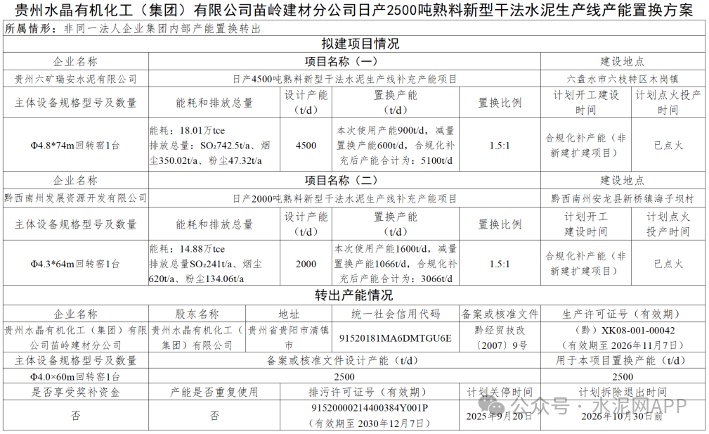 2025年12月31日,贵州省工信厅发布“关于贵州水晶有机化工(集团)有限公司苗岭建材分公司日产2500吨熟料新型干法水泥生产线产能置换方案的公示”。