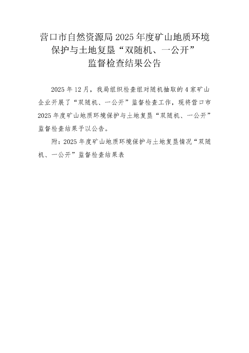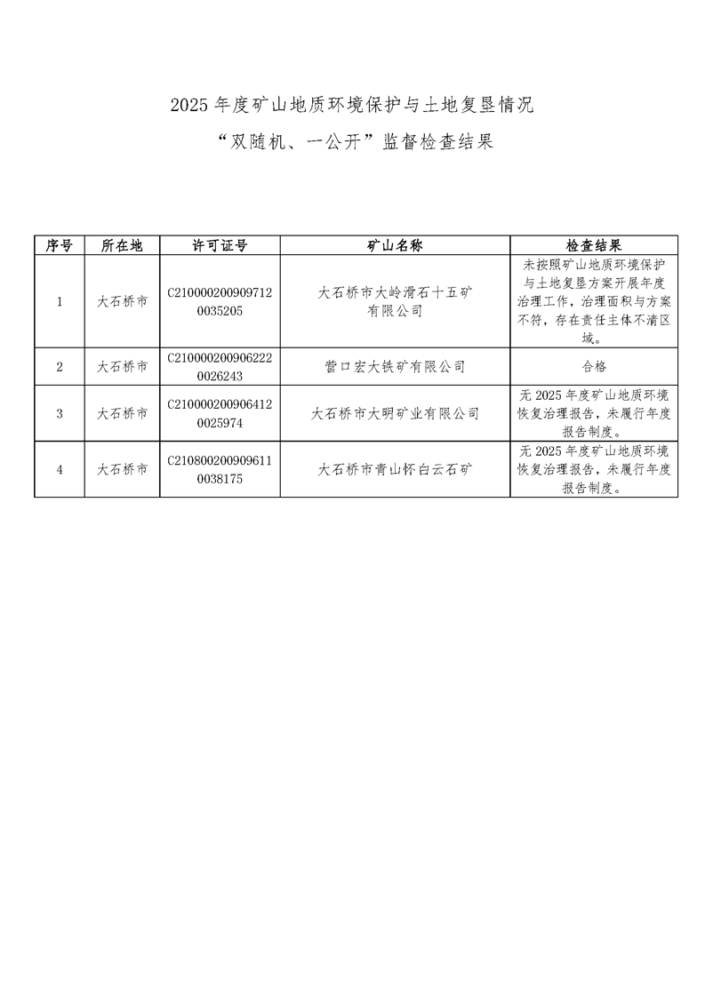 营口市自然资源局公布对大石桥十五矿、青山怀白云石矿等4家矿企的“双随机、一公开”监督检查结果