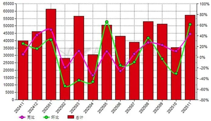 2025年11月份中国电熔镁砂出口量57,302.92公吨,去年同期为39,937.91公吨,上月为35,481.07公吨,同比上涨43.48%,环比上涨61.50%。