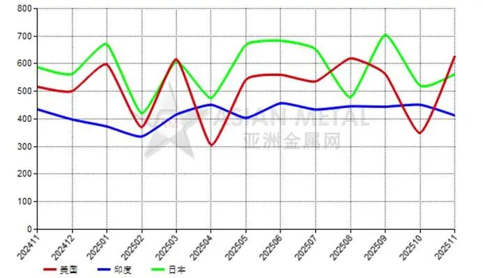 2025年11月,中国电熔镁砂前三大出口目的国为美国、印度和日本。