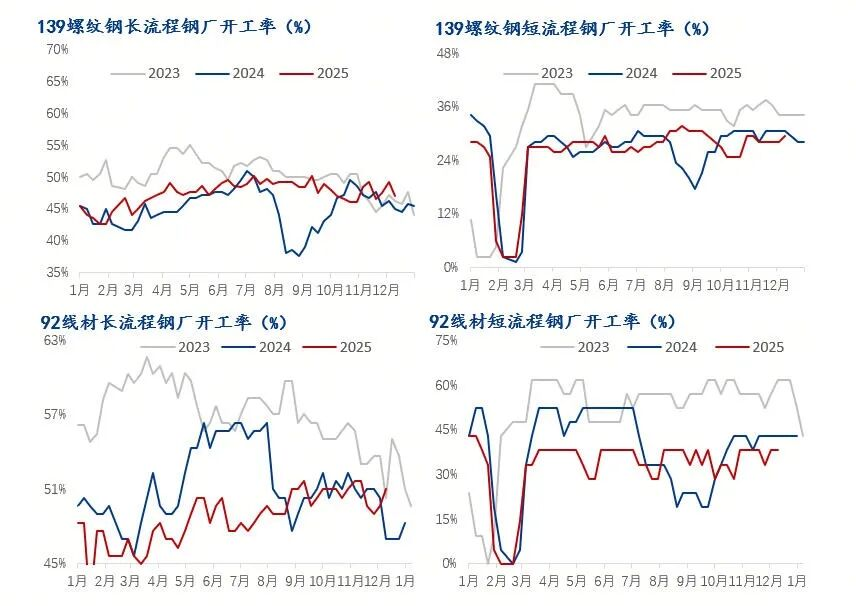 截止12月底,全国建筑钢材钢厂螺纹钢和线材开工率环比均有一定下降。12月25日,螺纹钢开工率为38.56%,较上月下降3.27个百分点,线材开工率42.44%,较上月下降6.4个百分点。分工艺来看,长流程企业螺纹钢开工率环比下降3.65个百分点,长流程线材开工率下降6.71个百分点;短流程螺纹钢开工率环比下降2.35个百分点,短流程线材开工率环比下降4.76个百分点。