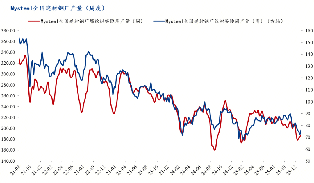 2、建筑钢材产量震荡小幅回落