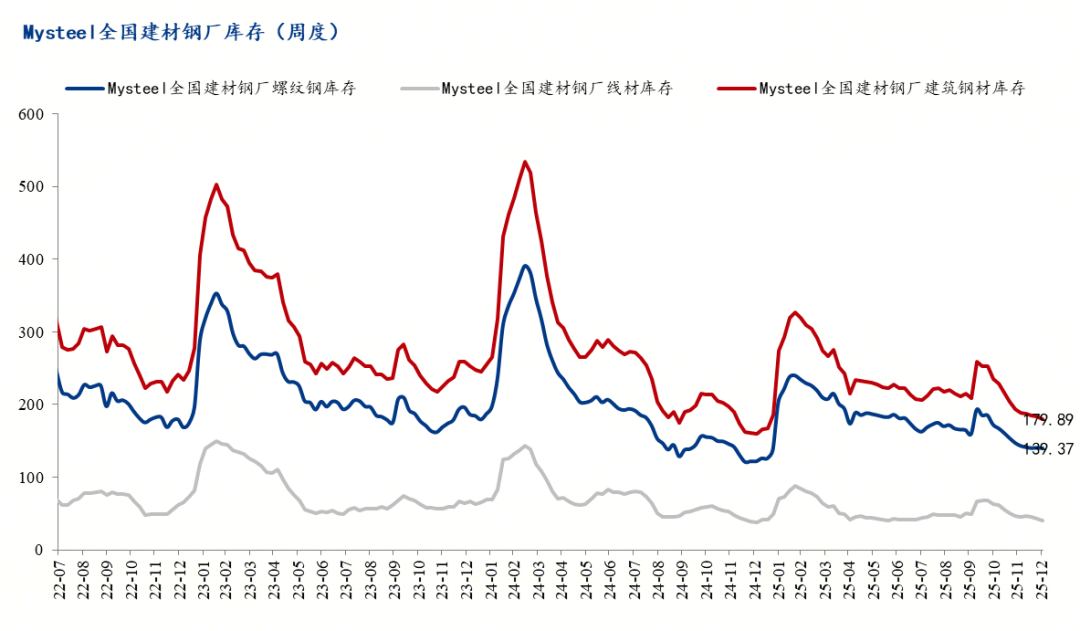 截止12月26日,Mysteel统计建筑钢材139家钢厂螺纹钢库存总量为140.06万吨,月环比下降6.67万吨,同比增加18.53万吨;92家钢厂线材库存43.32万吨,月环比下降3.34万吨,年同比增加4.1万吨。