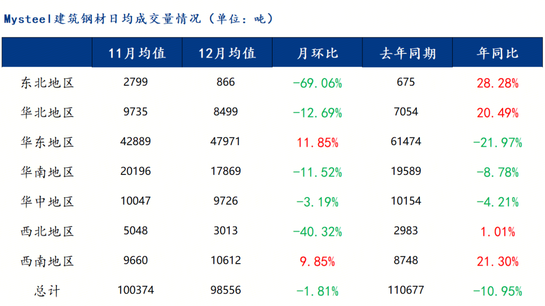 据调研,12月份全国样本贸易商成交量环比小幅下降。具体来看,七大区域成交量除了华东和西南外,其他市场均有一定回落。Mysteel统计12月份全国日均成交量为9.86万吨,月环比下降1.81%,年同比下降10.95%。