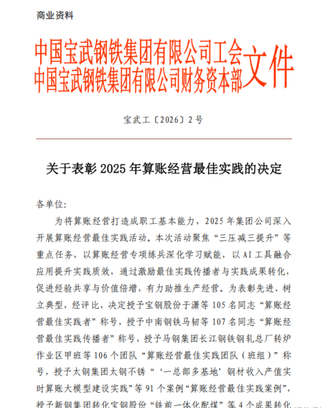 近日,中国宝武钢铁集团有限公司工会、财务资本部联合印发《关于表彰2025年算账经营最佳实践的决定》(宝武工〔2026〕2号),中钢洛耐低碳高性能材料分厂报送的《挂釉炉门砖技术迭代升级驱动降本实践》案例,凭借显著的降本成效与扎实的实践经验,成功获评“算账经营最佳实践案例”。