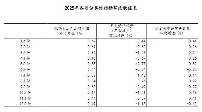 (2)根据季节调整模型自动修正结果,对近一年来各期国内生产总值、规模以上工业增加值、固定资产投资(不含农户)、社会消费品零售总额环比增速进行修订。修订结果及2025年四季度GDP环比数据、2025年12月份其他指标环比数据如下: