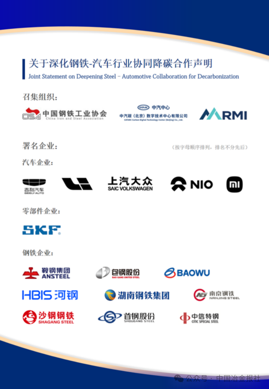 本次《合作声明》由中钢协、中汽中心(中汽碳)与落基山研究所共同召集发布。来自汽车企业的吉利汽车、理想汽车、上汽大众、蔚来汽车、小米汽车,零部件企业斯凯孚,以及钢铁企业鞍钢集团、包钢股份、宝武集团、河钢集团、湖南钢铁集团、南京钢铁、沙钢钢铁、首钢股份、中信泰富特钢等加入了《合作声明》(按字母顺序排列,排名不分先后)。各方表示将以声明为行动框架,持续推进标准协同、技术创新与产业合作,共同促进低碳排放钢在汽车行业的规模化应用与市场化发展。