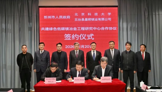 2026年1月20日,山西省忻州市人民政府、北京科技大学与五台县星明镁业有限公司共建绿色低碳镁冶金工程研究中心合作协议签约仪式正式举行。忻州市市委书记朱晓东出席并讲话,市委副书记、市长李建国主持仪式,北京科技大学党委副书记郑安阳,浙江耀宁科技集团董事长李星星等政企校代表共同见证这一产业创新合作里程碑。此次三方携手,将聚焦“绿电冶镁”核心技术突破,为忻州打造山西特色新型材料基地注入科技动能,推动区域镁产业向绿色化、高端化转型。