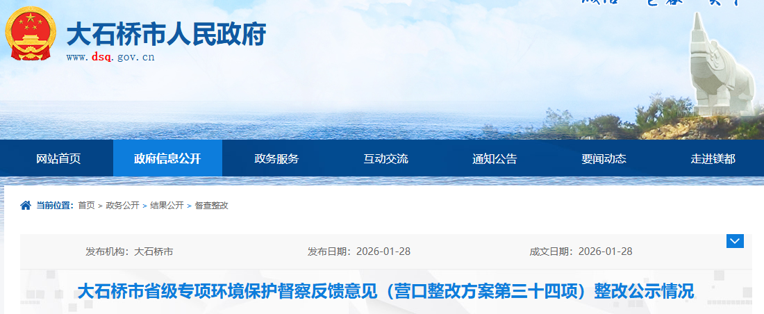 以上整改情况向社会公示,如有异议,请以书面或电话形式,向大石桥市环境保护督察整改工作领导小组办公室、大石桥市发改局反映。邮寄的以邮戳为准,直接送达的以送达日期为准。