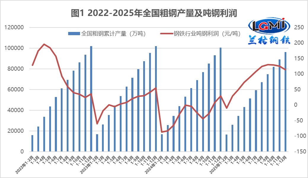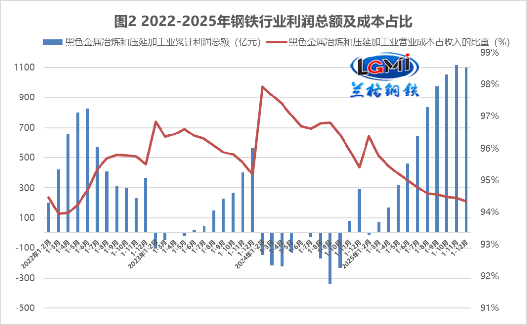 据国家统计局数据显示,2025年1-12月份,黑色金属冶炼和压延加工业实现营业收入77268.3亿元,同比下降4.7%;营业成本72899.0亿元,同比下降5.7%;利润总额1098.3亿元,同比增长299.2%。兰格点评