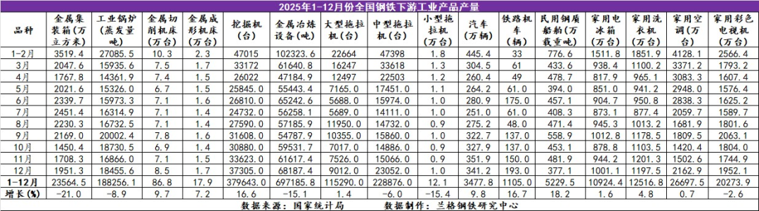 表2 2025年1-12月全国钢铁下游工业产品产量