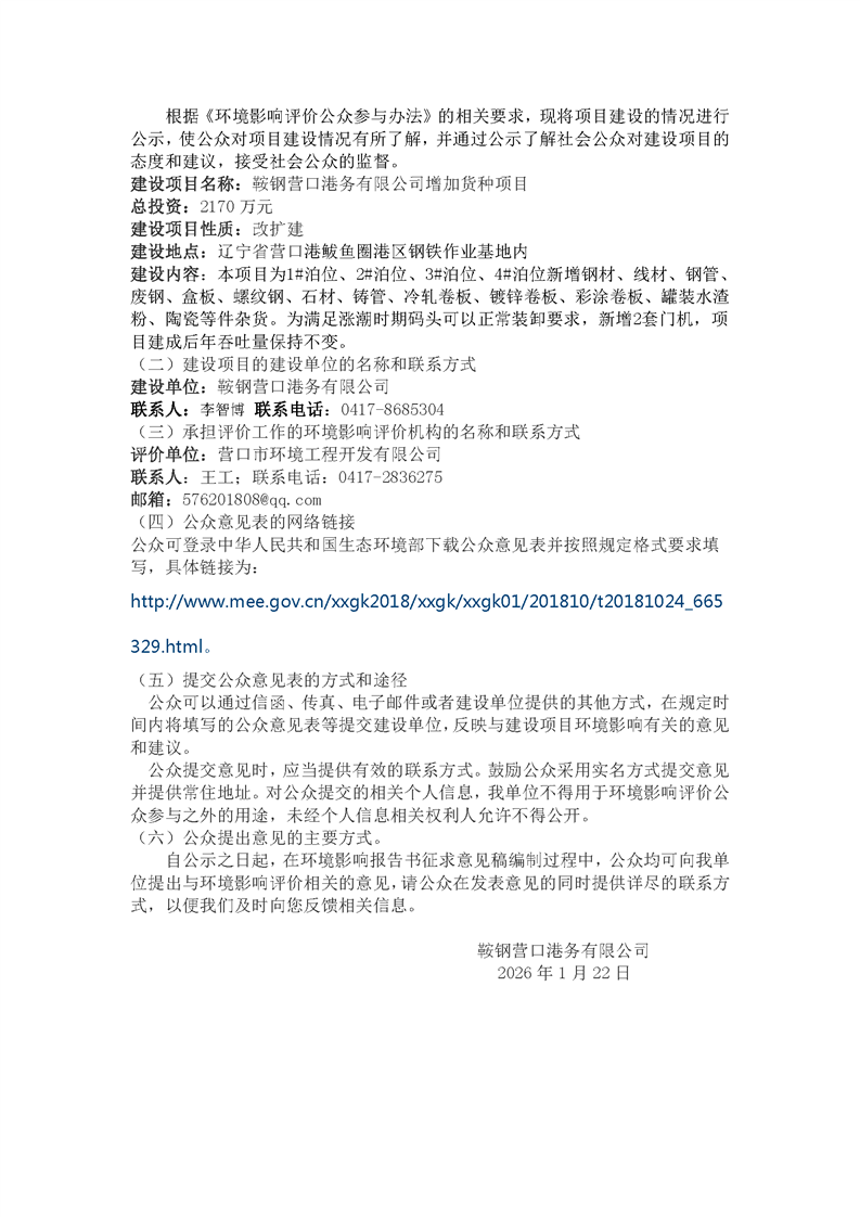 鞍钢营口港务有限公司增加货种项目公众参与第一次公示