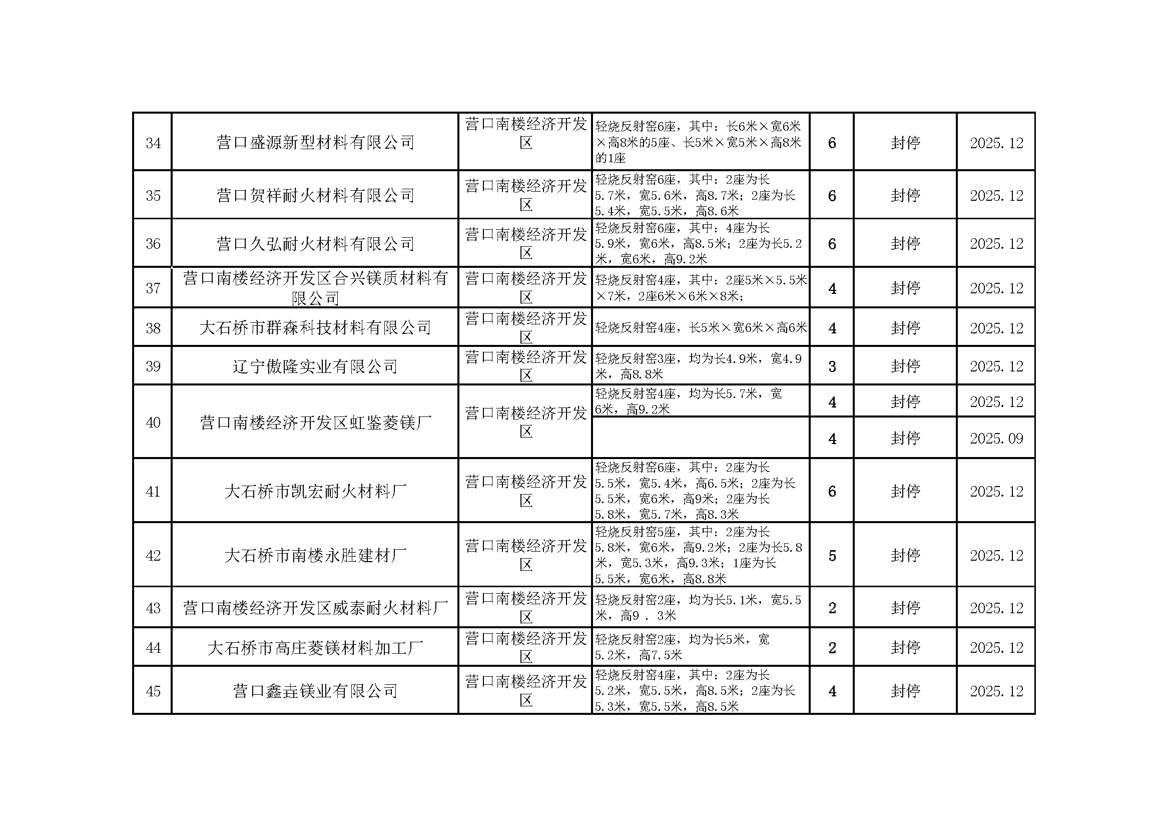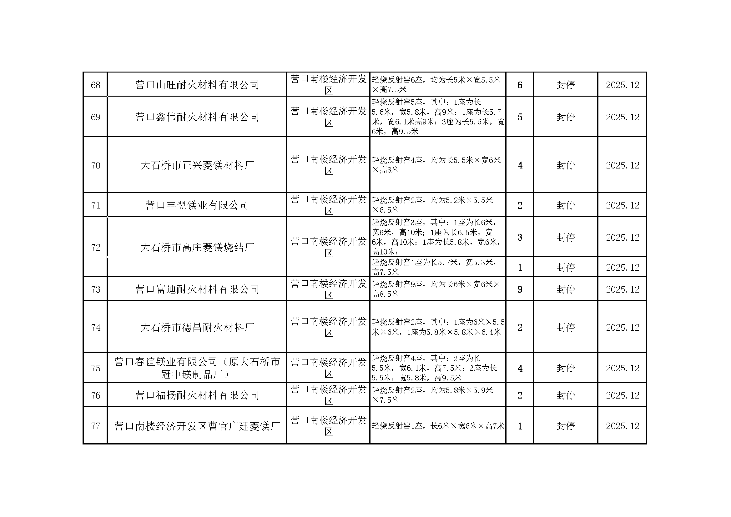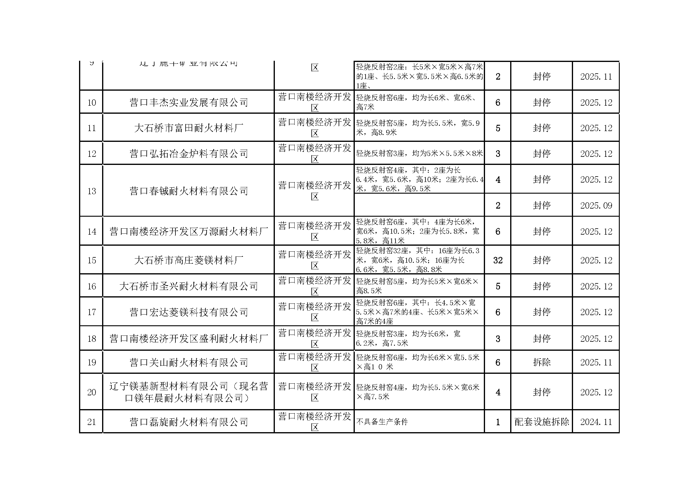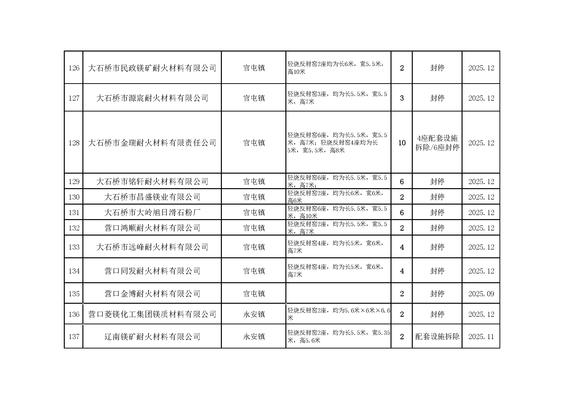 依据《辽宁省人民政府办公厅关于推进菱镁行业高质量发展的实施意见》(辽政办发〔2023〕15号)及《辽宁省轻烧反射窑淘汰工作方案》(辽工信建材〔2024〕18号)要求,我市对辖区内轻烧反射窑开展封停淘汰工作。截至2026年1月31日,全部核验完毕,现将相关淘汰情况予以通告,接受社会监督。企业或个人若对淘汰工作有异议,可如实反映有关情况。