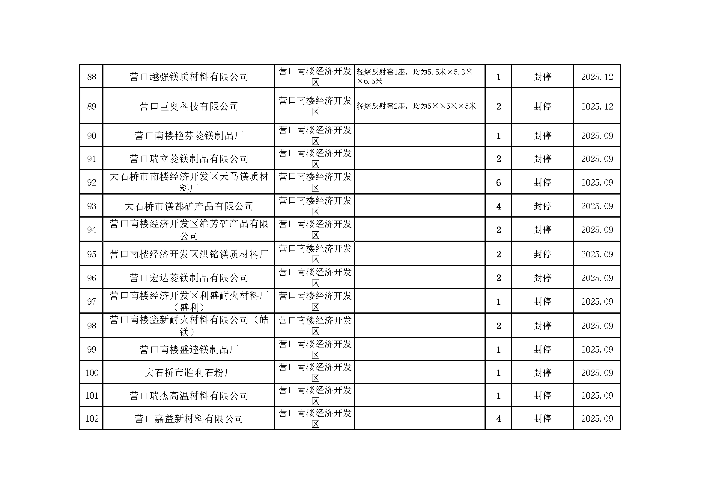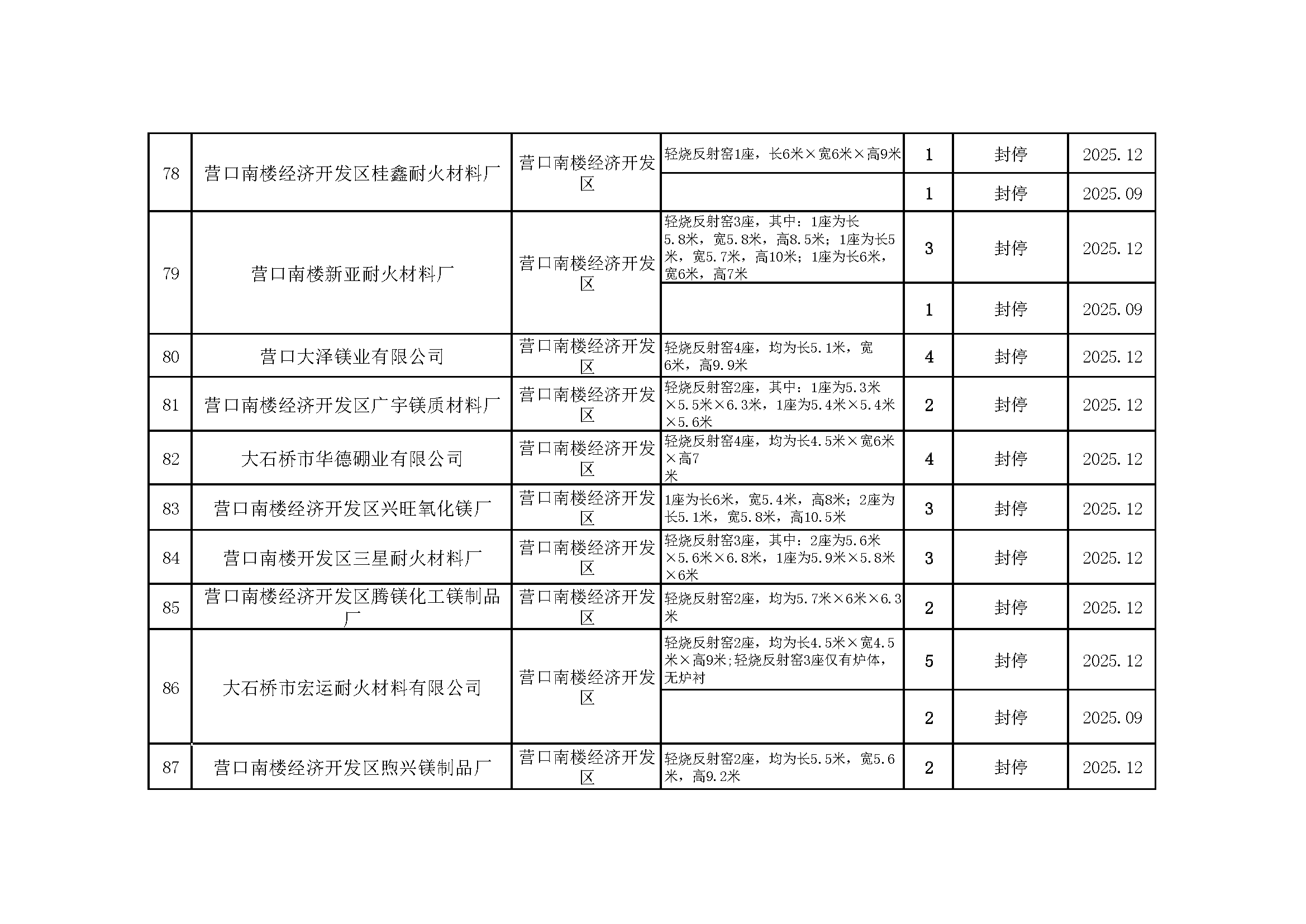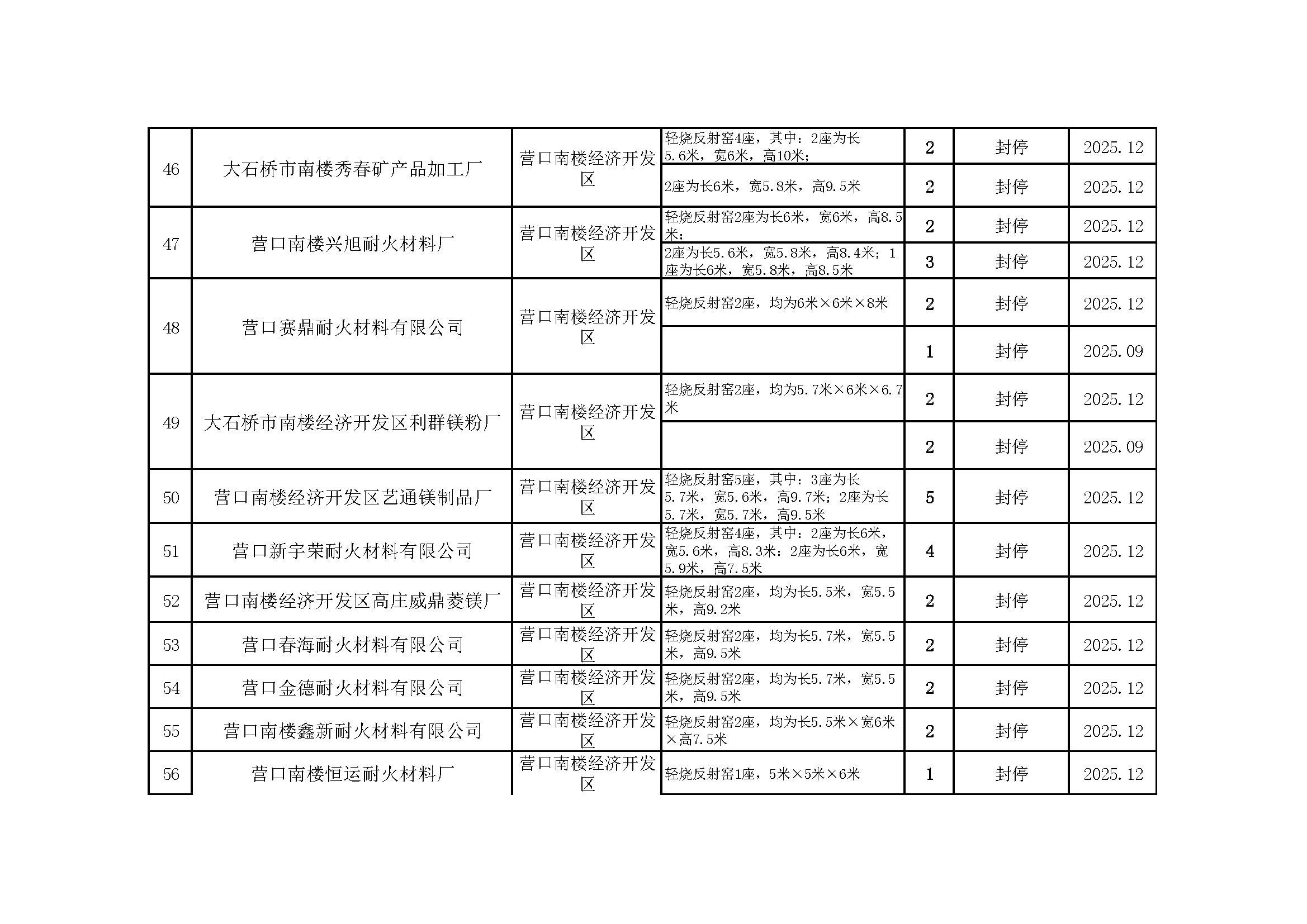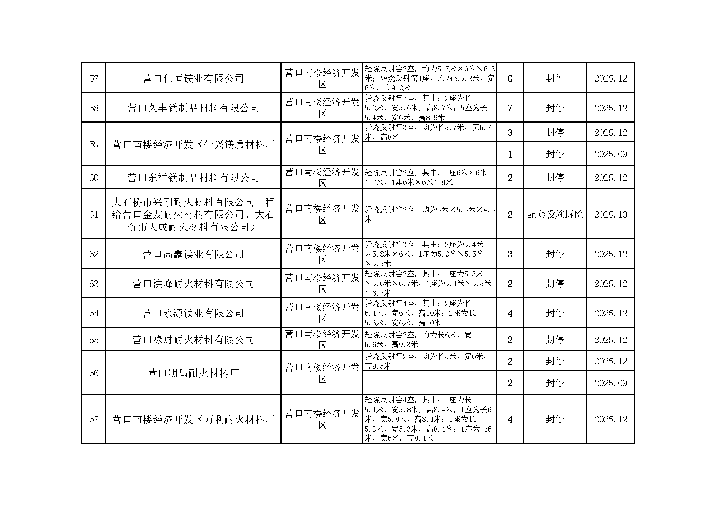 依据《辽宁省人民政府办公厅关于推进菱镁行业高质量发展的实施意见》(辽政办发〔2023〕15号)及《辽宁省轻烧反射窑淘汰工作方案》(辽工信建材〔2024〕18号)要求,我市对辖区内轻烧反射窑开展封停淘汰工作。截至2026年1月31日,全部核验完毕,现将相关淘汰情况予以通告,接受社会监督。企业或个人若对淘汰工作有异议,可如实反映有关情况。