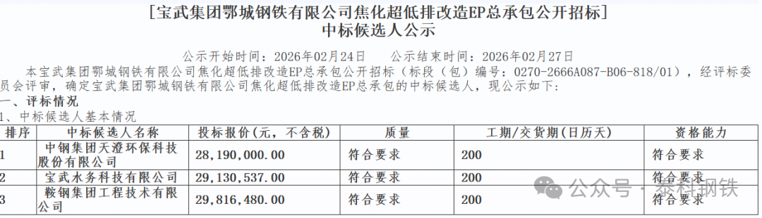 2026年2月24日,宝武集团鄂城钢铁有限公司焦化超低排改造EP总承包中标候选人公示。