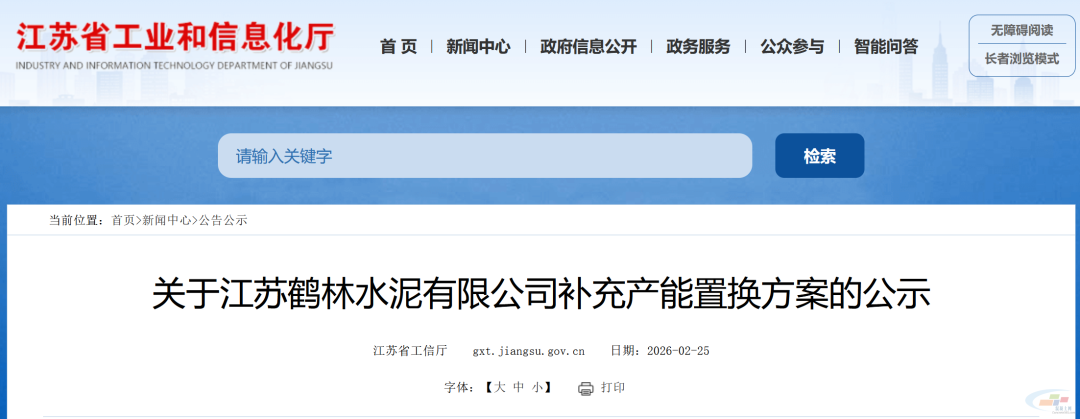 现将江苏鹤林水泥有限公司补充产能置换方案予以公示,欢迎社会公众进行监督。公示时间为2026年2月25日至3月9日。公示期间如有异议,请以书面形式向江苏省工业和信息化厅反映情况。