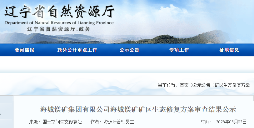 根据《土地复垦条例》和《辽宁省地质环境保护条例》有关要求,我厅委托自然资源事务服务中心组织专家对《海城镁矿集团有限公司海城镁矿矿区生态修复方案》进行了审查。现将拟同意通过的该方案及专家评审意见进行公示,公示期自发布之日起5个工作日。