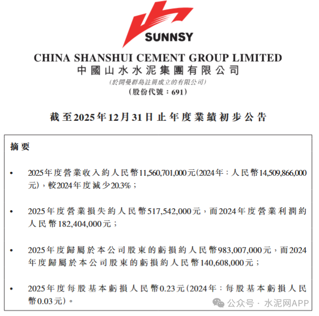 3月4日晚间,山水水泥公布2025年业绩,营业收入约人民币115.61亿元,较2024年度减少20.3%;归属于公司股东的亏损约9.83亿元,2024年度亏损约1.41亿元。公告称,收益减少主要由于本年度水泥销量同比减少14.9%及价格同比下降4.7%所致。亏损主要由于水泥受市场需求疲弱,价量齐跌,营业毛利下滑,及停产企业或产线相关厂房设备等固定资产估列减值损失增加,全年度亏损较去年同期增加9.02亿元。