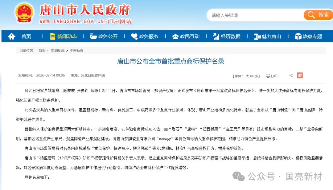 近日,唐山市市场监管局(知识产权局)正式发布《唐山市第一批重点商标保护名录》,河北国亮新材料股份有限公司(简称“国亮新材”)的“唐特”商标凭借深厚的品牌底蕴、突出的市场影响力及完善的商标保护体系,成功入选该名录,标志着公司在品牌保护与知识产权战略层面获重要权威认可。