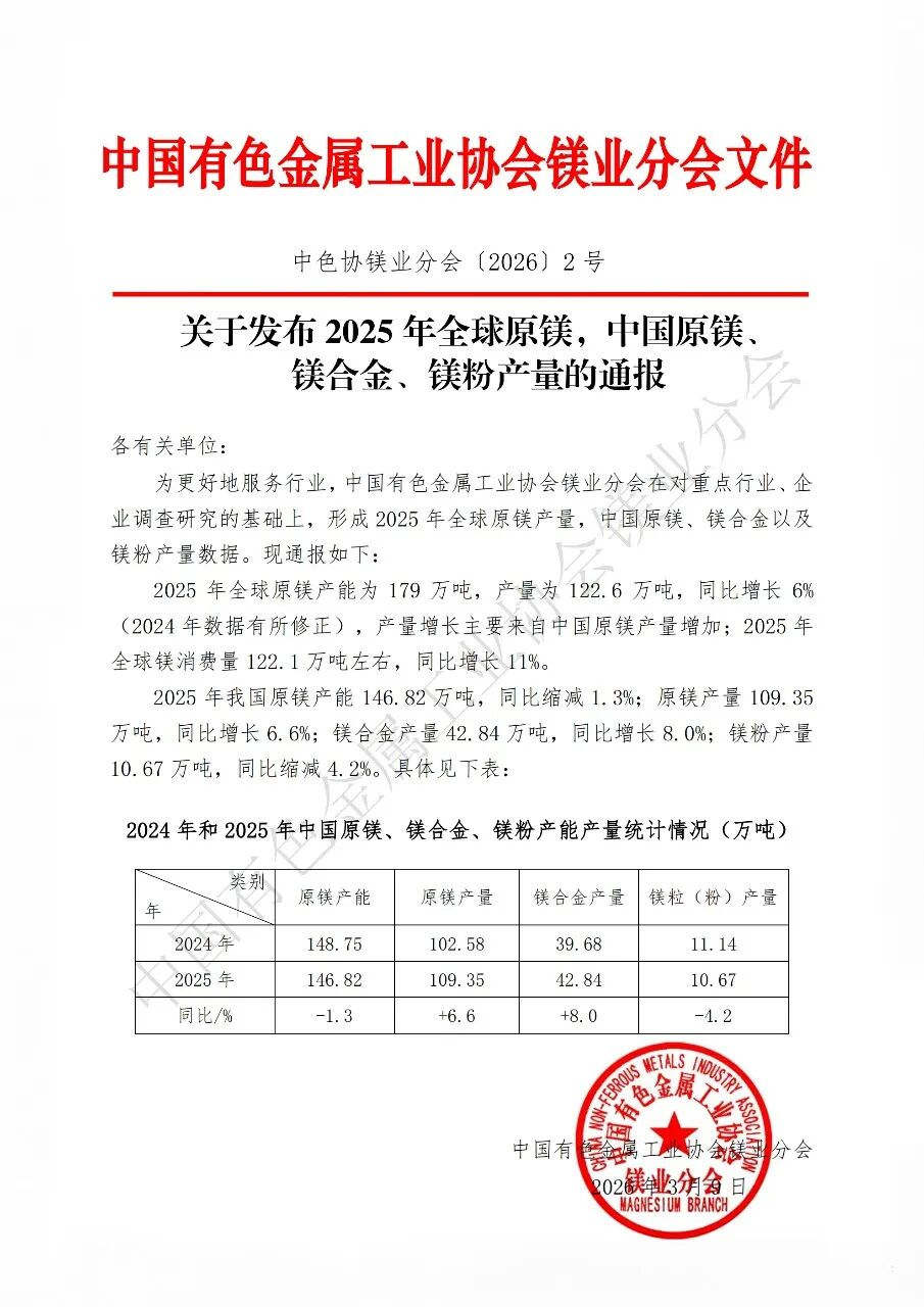2026年3月9日,中国有色金属工业协会镁业分会正式发布《2025年全球原镁、中国原镁、镁合金、镁粉产量通报》,完成全球及中国镁产业运行数据的年度更新与历史修正。