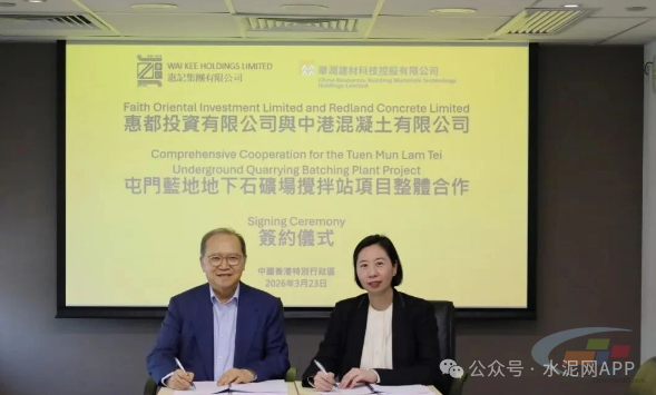 3月23日,华润建材科技旗下中港混凝土与香港惠记集团旗下惠都投资在香港举行“屯门蓝地地下石矿场搅拌站项目”合作签约仪式。华润建材科技董事局主席景世青,副总裁潘飞,惠记集团主席单伟彪等出席相关活动。