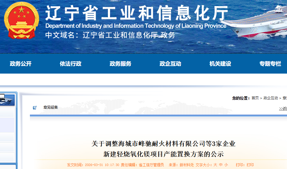 按照《辽宁省人民政府办公厅关于推进菱镁行业高质量发展的实施意见》(辽政办发〔2023〕15号)、《省直7部门关于做好菱镁行业专项整治有关工作意见的函》(辽发改工业字〔2026〕8号)、《辽宁省菱镁矿浮选及镁砂行业产能置换办法》(辽工信建材〔2024〕18号)要求,根据企业的调整申请及鞍山市工信局初审,因海城市峰驰耐火材料有限公司等3家企业新建项目名称、建设主体及新建主体设备等信息变更,现将调整后的方案予以公示,公示期为10个工作日。