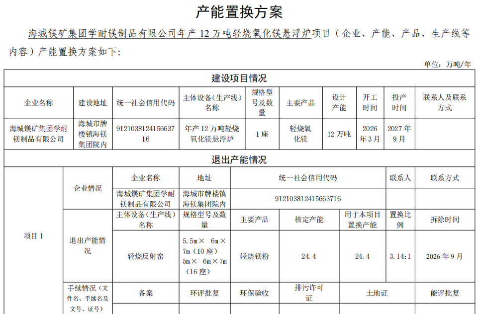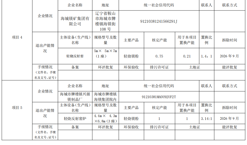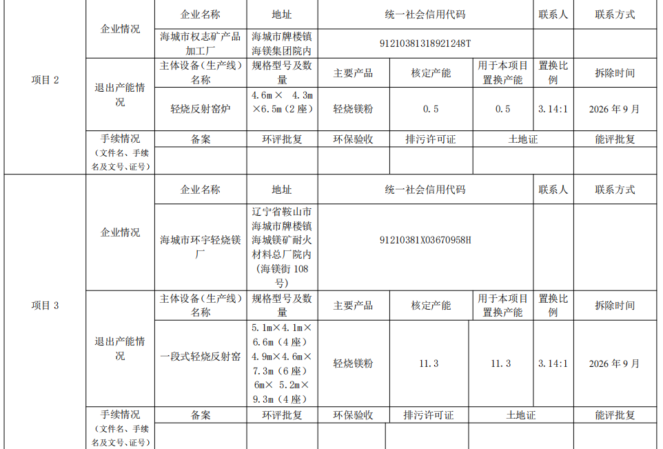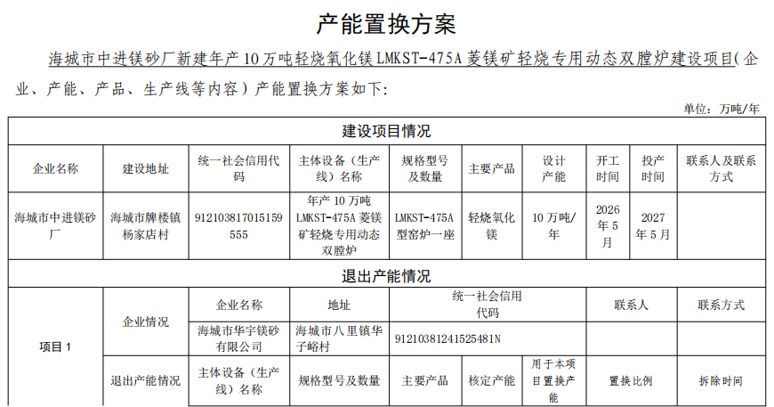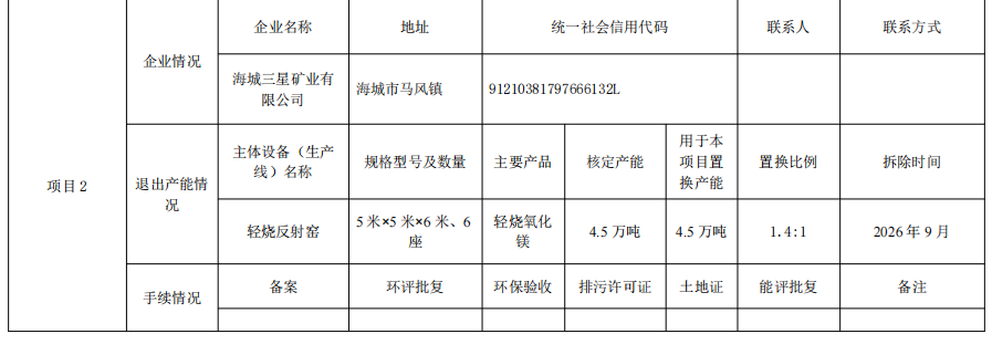 2.海城市中进镁砂厂产能置换方案
