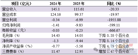 其他指标方面悉数转差。全年综合毛利率录得14.05%,比2024年同期下降0.38个百分点;净资产收益率-5.56%,较同期下降4.79个百分点。由于营业收入降幅较大,公司三费费率小幅增加1.47个百分点至12.95%。