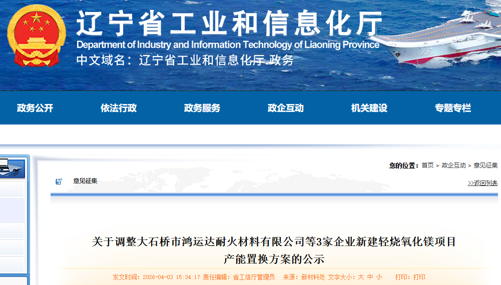 按照《辽宁省人民政府办公厅关于推进菱镁行业高质量发展的实施意见》(辽政办发〔2023〕15号)、《省直7部门关于做好菱镁行业专项整治有关工作意见的函》(辽发改工业字〔2026〕8号)、《辽宁省菱镁矿浮选及镁砂行业产能置换办法》(辽工信建材〔2024〕18号)要求,根据企业的调整申请及营口市工信局初审,因大石桥市鸿运达耐火材料有限公司等3家新建项目名称、建设主体及新建主体设备等信息变更,现将调整后的方案予以公示,公示期为10个工作日。