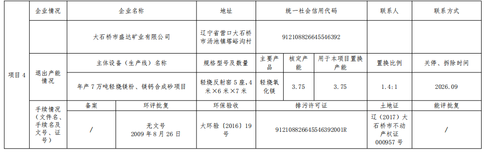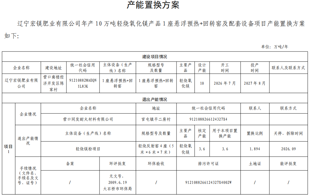 我厅2025年1月15日《关于营口关山耐火材料有限公司等企业新建轻烧氧化镁项目产能置换方案的公告》中大石桥市鸿运达耐火材料有限公司产能置换方案,2026年3月3日《关于营口双骏实业有限公司等8户企业新建轻烧氧化镁项目产能置换方案的通告》中营口双骏实业有限公司产能置换方案、营口希尔实业发展有限公司产能置换方案拟撤销。