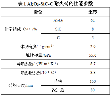 福山区2#炼钢厂的铁水包主要承接高炉铁水,并通过机械搅拌脱硫后,转移到炼钢转炉进行冶炼。铁水包上部空置区域的包璧不与铁水直接接触,仅遭受铁水热辐射作用,通常采用氧化铝质耐火材料,渣线及下部区域与包底遭受侵蚀较严重,主要采用Al2O3-SiC-C耐火砖,性能见表1。铁水包损毁主要是由工作衬剥落(包括热剥落、结构剥落及机械剥落)导致的,其中剥落严重的部位在工作衬侧壁,反复的热膨胀导致耐火砖出现裂纹,引起衬砖的脱落,常需要进行修补。