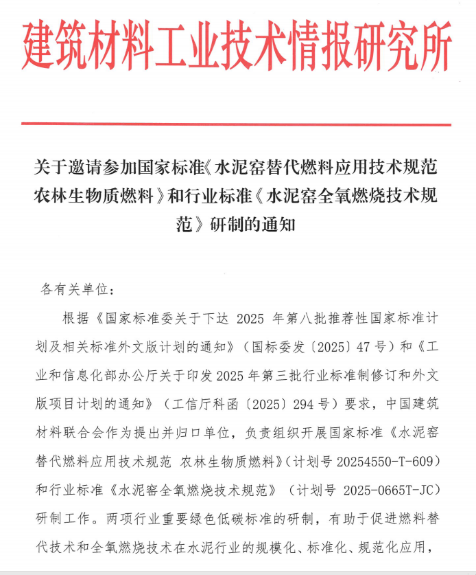 国标《水泥窑替代燃料应用技术规范农林生物质燃料》及行标《水泥窑全氧燃烧技术规范》参编邀请