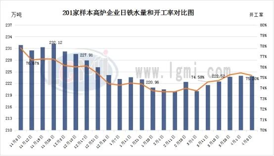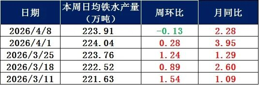 据调研,全国201家生产企业铁水日均产量为223.91万吨,较上周下降0.13万吨;26年4月份日均铁水产量为223.97万吨,日均产量环比3月增加1.97万吨。
