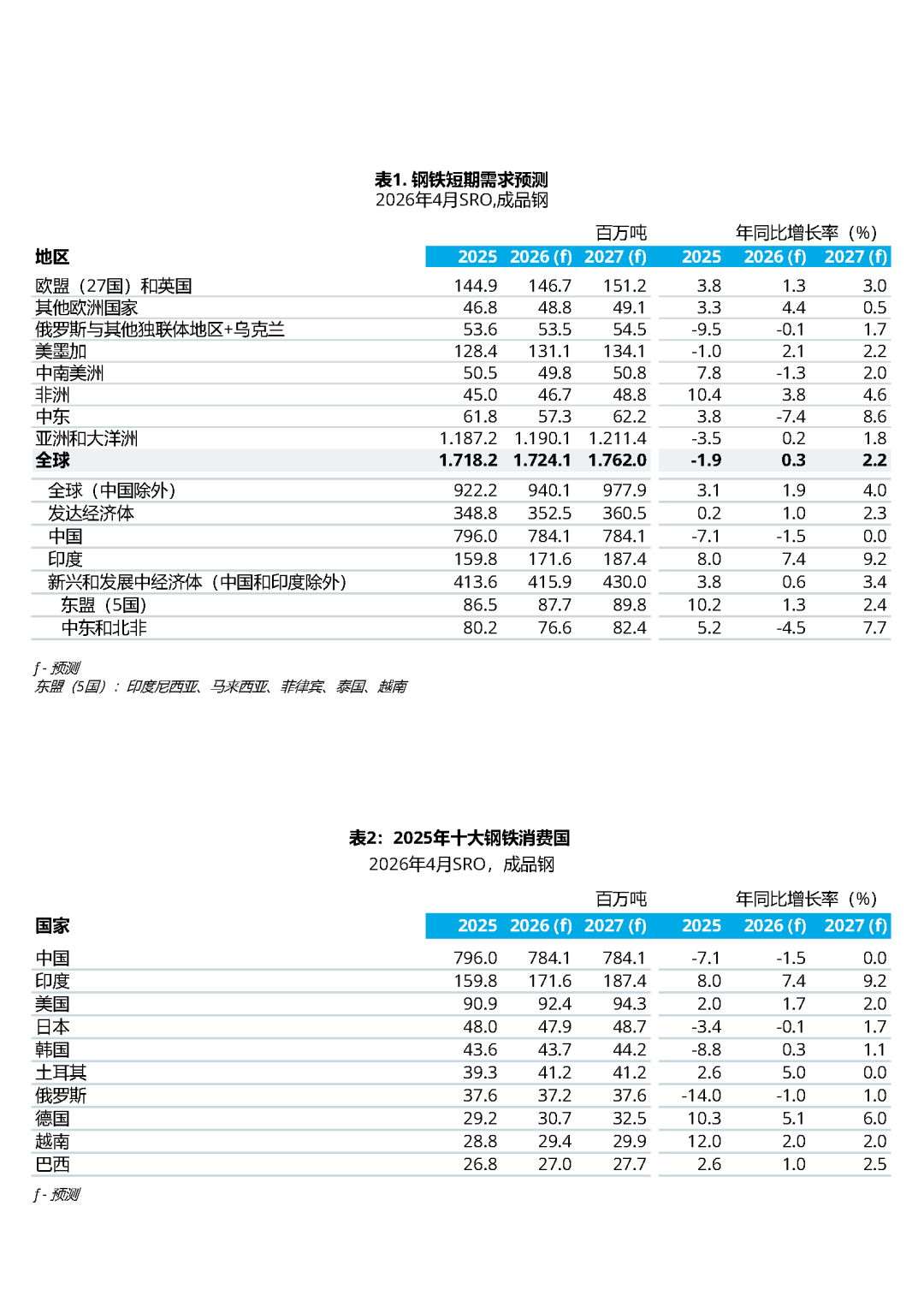 短期钢铁需求预测(SRO)结果包括预测报告、预估值及其他信息等,尽管这些前瞻性的结果代表我们目前对未来钢铁需求的判断,但预测结果存在着风险性及不确定性因素,可能与实际钢铁需求存在重大的差异,我们提醒读者不要过度依赖这些前瞻性的结果,目前的预测结果仅代表世界钢铁协会在本预测结果发布之日的观点。