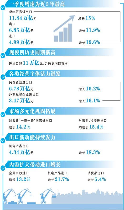“今年以来,外部形势更加复杂多变,我国外贸起势有力、开局良好。”海关总署副署长王军表示,一季度进出口超过11万亿元,为历史同期首次,季度增速也是近5年最高。