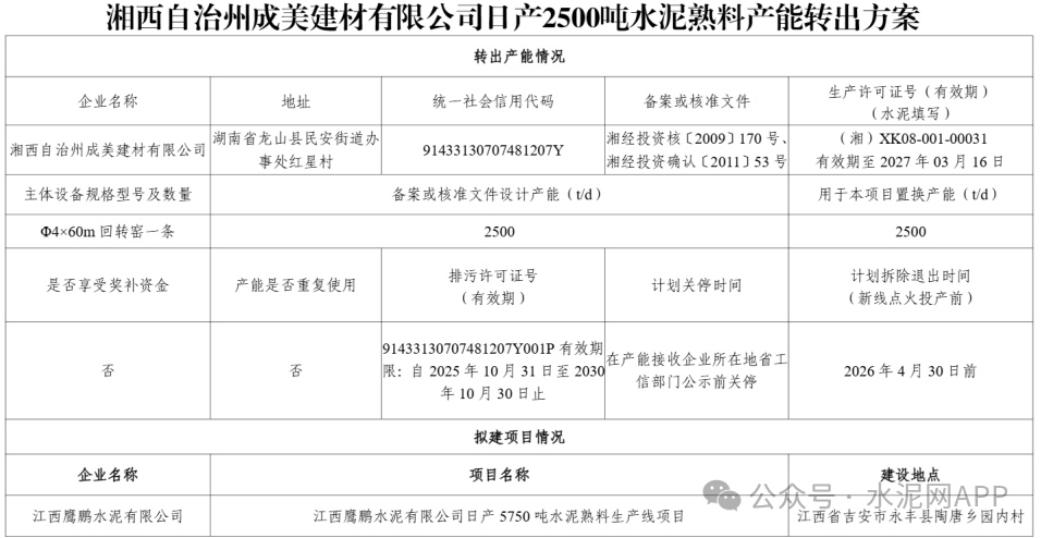 据了解,湘西自治州成美建材有限公司出让2500t/d产能至江西鹰鹏水泥有限公司,用于补充4500t/d至5750t/d,置换比例2∶1。
