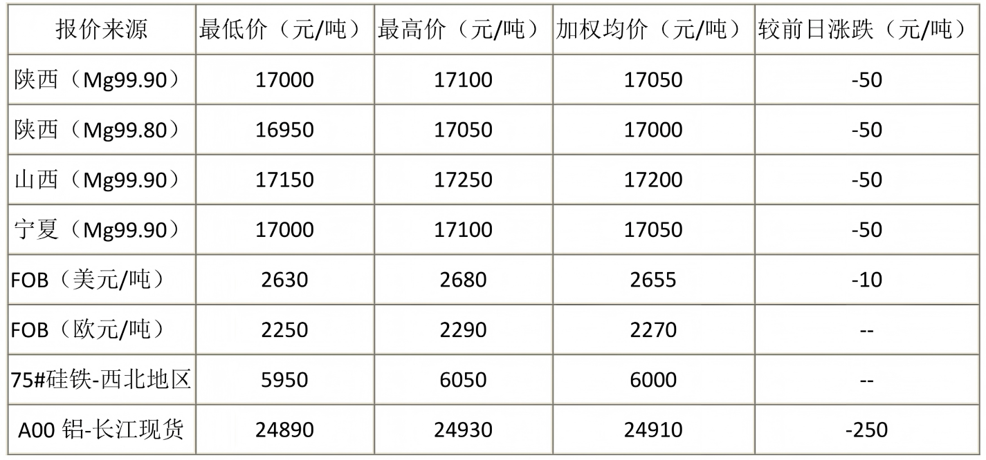 2. 原镁报价为按照报价企业产量加权计算后所得平均值,并按50元/吨取整;3. 表中价格均为现货含税、现金、不酸洗价,国内单位为元/吨;4. FOB为天津港离岸价格。