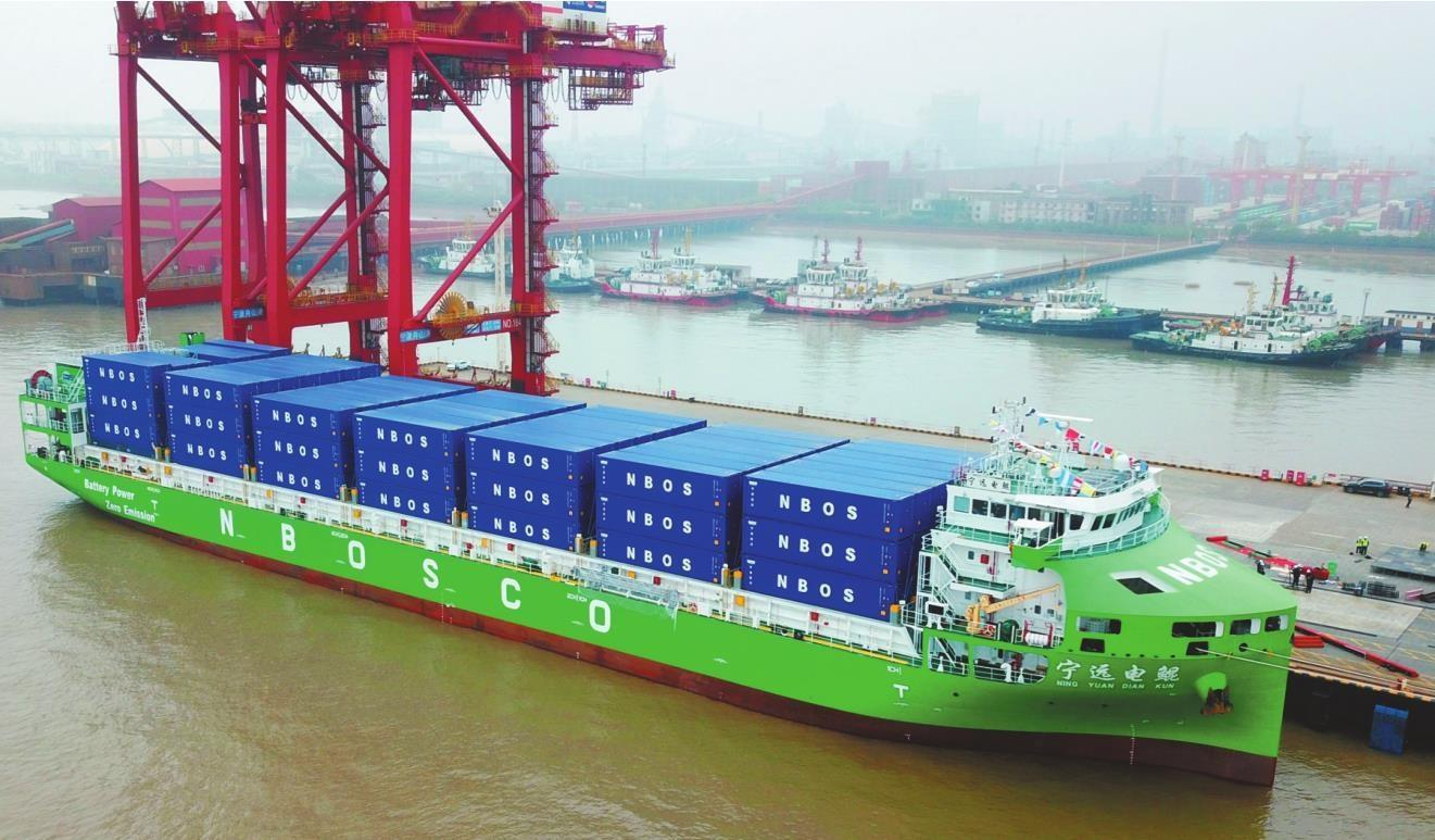 4月15日,纯电动智能集装箱海船“宁远电鲲”轮停泊在宁波舟山港北仑港区,准备启航(无人机照片)。4月15日,全球最大、国内首艘万吨级纯电动智能集装箱海船“宁远电鲲”轮启航,标志着该船正式投入商业航线运营。“宁远电鲲”轮由宁波远洋运输股份有限公司打造,总长127.8米、宽21.6米,可装载742标准箱货物。船舶采用10个标准化箱式电池作为核心动力,总储电量约2万度,该船投用后,预计每年可节约燃油580吨,减少二氧化碳排放量超1400吨。