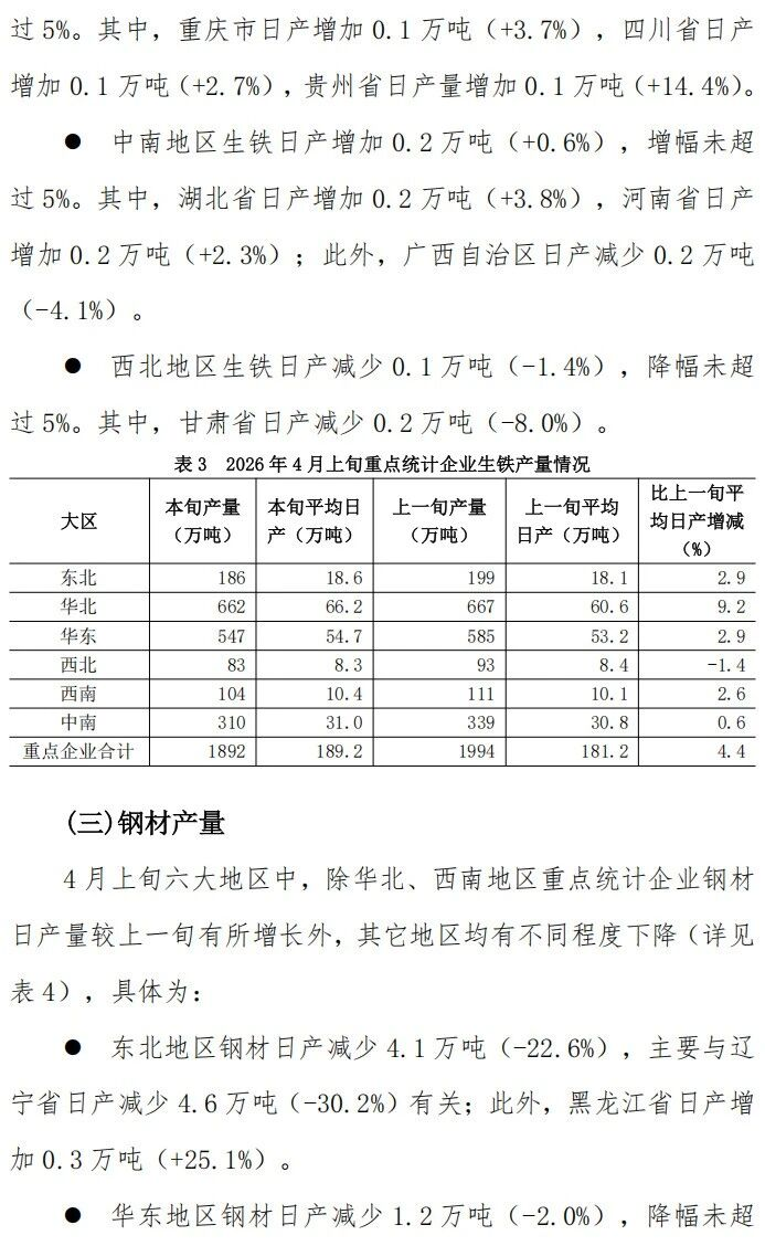 4月上旬重点统计企业钢铁产量旬报