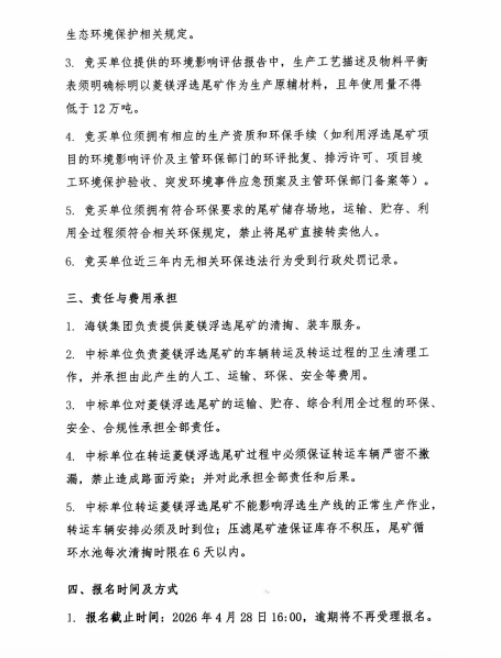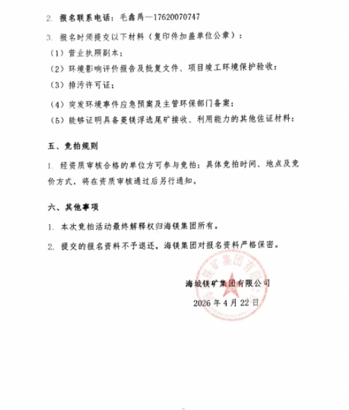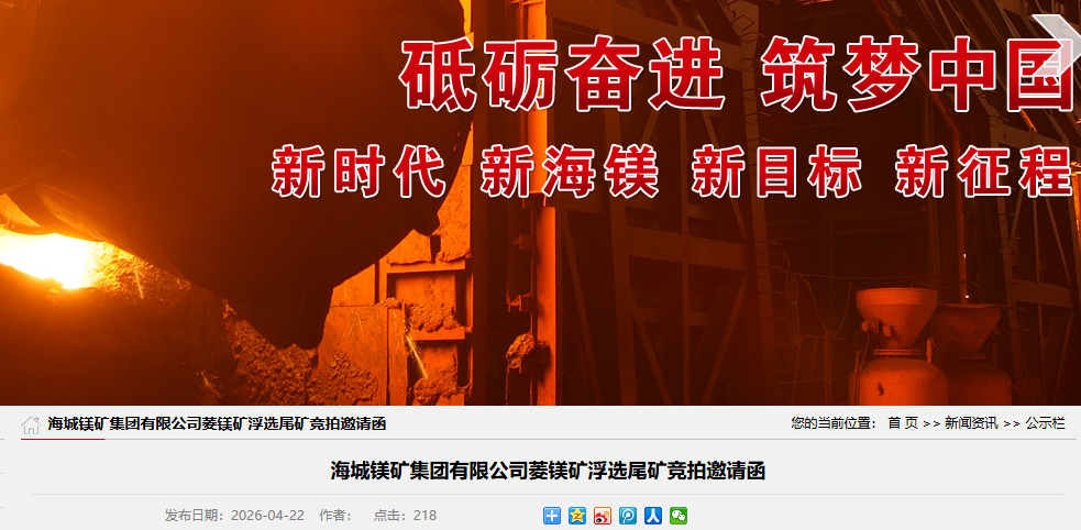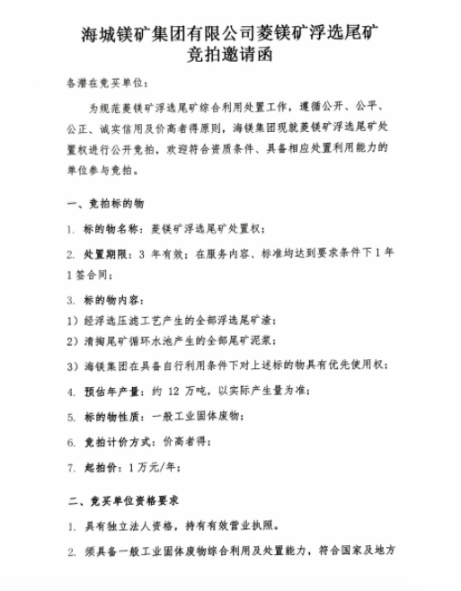 海城镁矿集团有限公司菱镁矿浮选尾矿竞拍邀请函