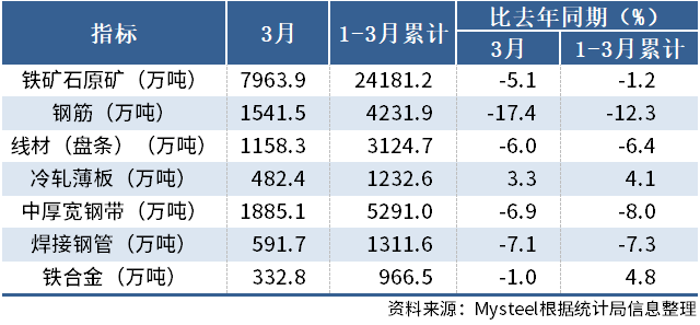 国家统计局最新数据显示,2026年3月份,中国钢筋产量为1541.5万吨,同比下降17.4%;1-3月累计产量为4231.9万吨,同比下降12.3%。3月份,中国中厚宽钢带产量为1885.1万吨,同比下降6.9%;1-3月累计产量为5291.0万吨,同比下降8.0%。3月份,中国线材(盘条)产量为1158.3万吨,同比下降6.0%;1-3月累计产量为3124.7万吨,同比下降6.4%。3月份,中国铁矿石原矿产量为7963.9万吨,同比下降5.1%;1-3月累计产量为24181.2万吨,同比下降1.2%。