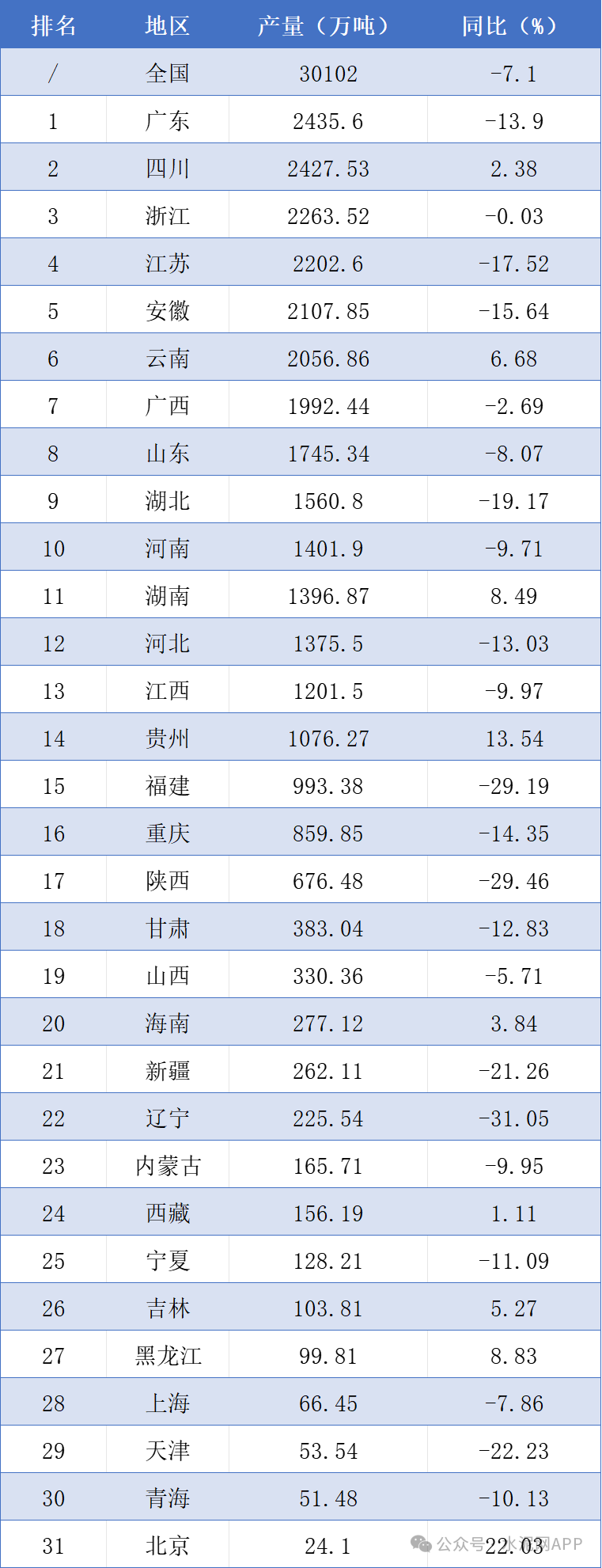 国家统计局数据显示,2026年一季度全国水泥产量30102万吨,同比下降7.1%。从分省市数据来看,一季度广东以产量2435.60万吨位列第一,四川产量2427.53万吨排在第二,浙江产量2263.52万吨排在第三。同比来看,全国共9个地区上涨,22个地区下滑。