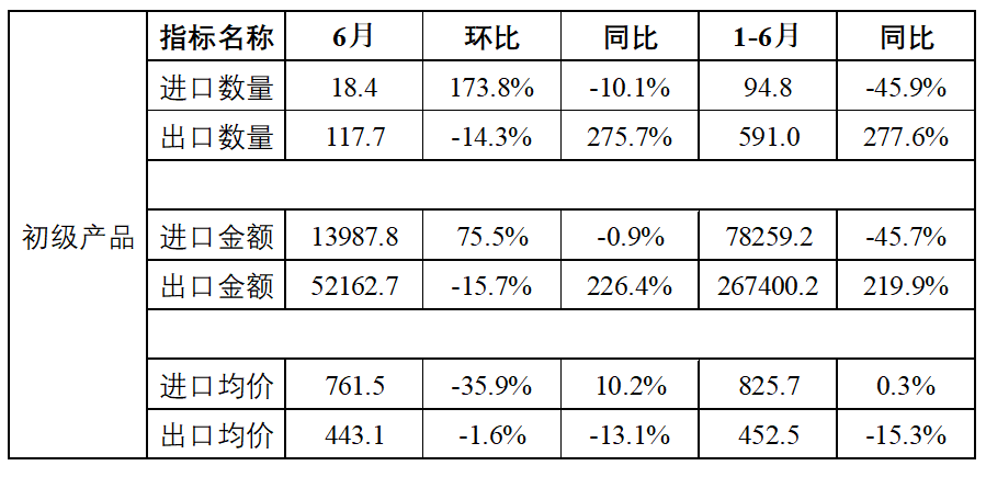 表2 2025年6月中国初级产品进出口情况