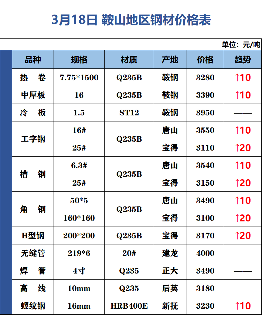 3月18日 鞍山地区钢材价格表