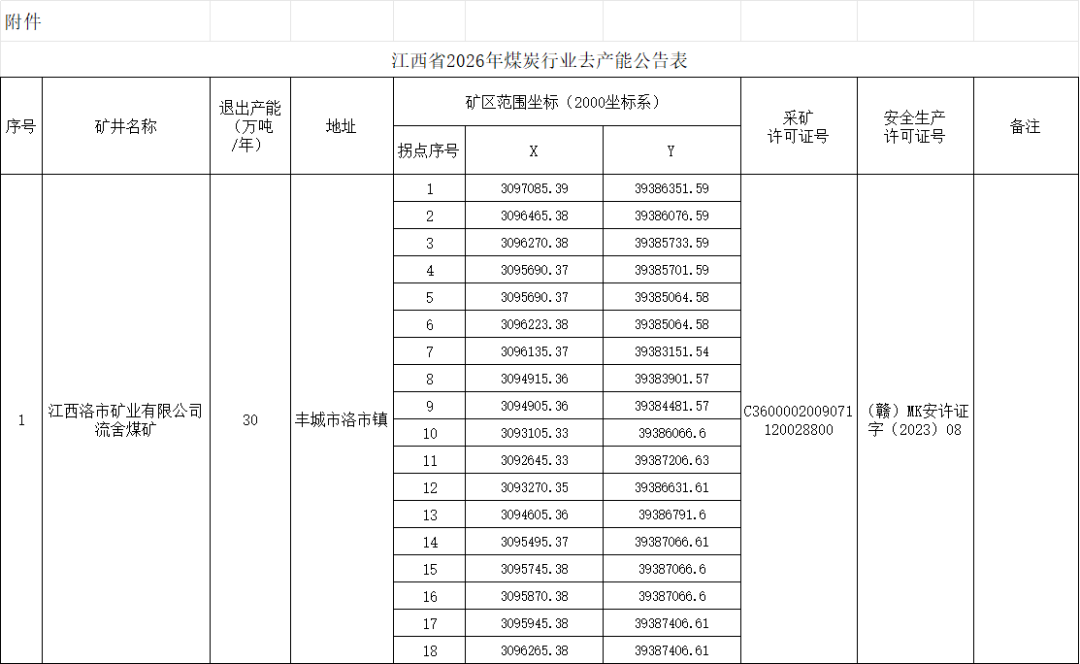 附件:江西省2026年煤炭行业去产能公告表