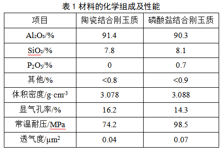 试验第一步在纯H2气氛中进行实验室条件下的基准测试,评估磷酸盐结合与陶瓷结合耐火材料的性能差异;第二步模拟直接还原工艺的简化气体气氛(73 mol% H2/27mol% CO、90mol% H2/10mol% H2O)开展测试,通过质量损失情况评估材料性能下降程度。研究材料分别为耐压强度和抗热震性能优良的磷酸盐结合刚玉质和热稳定性优异的陶瓷结合刚玉质耐火材料。材料的化学组成及性能见表1。