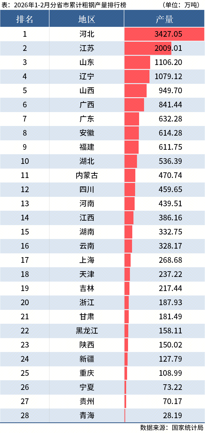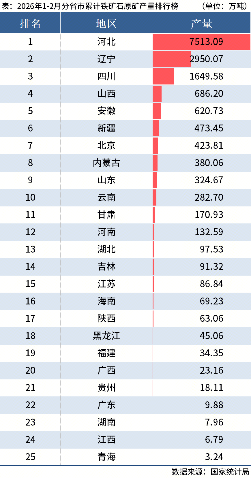 国家统计局:1-2月全国分省市粗钢、铁矿石原矿情况