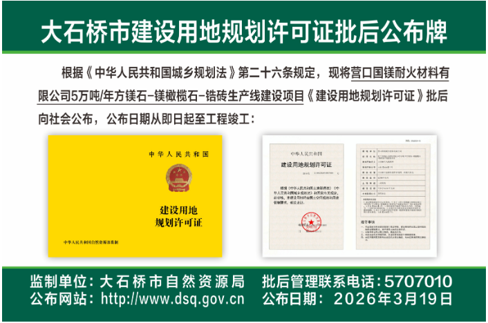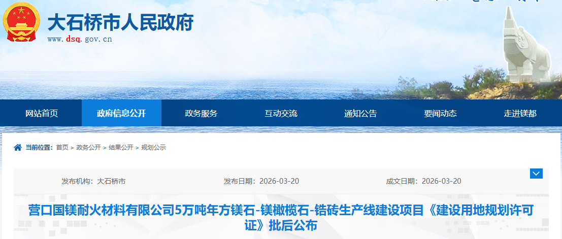 营口国镁耐火材料有限公司5万吨年方镁石-镁橄榄石-锆砖生产线建设项目《建设用地规划许可证》批后公布 ​