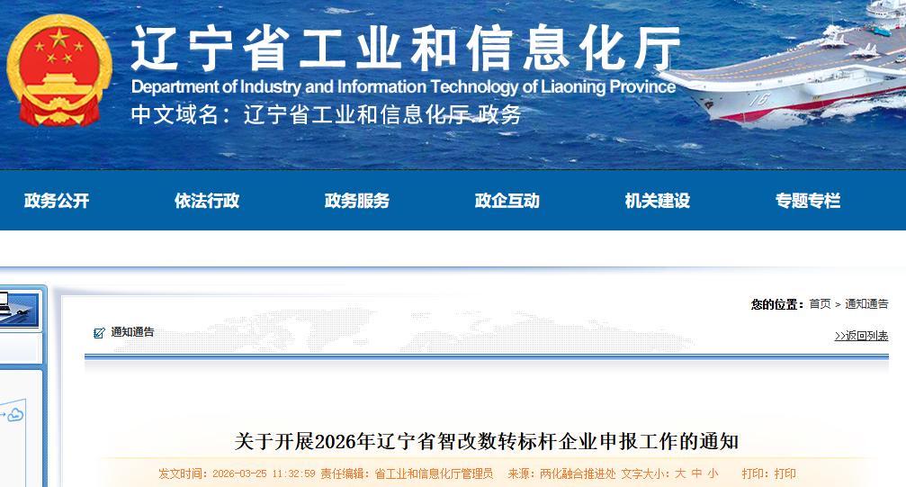 为贯彻落实《辽宁省深化制造业智能化改造数字化转型三年行动计划(2026-2028年)》,分行业培育智改数转标杆企业,发挥示范引领作用,加快推动制造业数字化、智能化、网络化转型升级。现组织开展2026年智改数转标杆企业申报工作。有关事项通知如下: